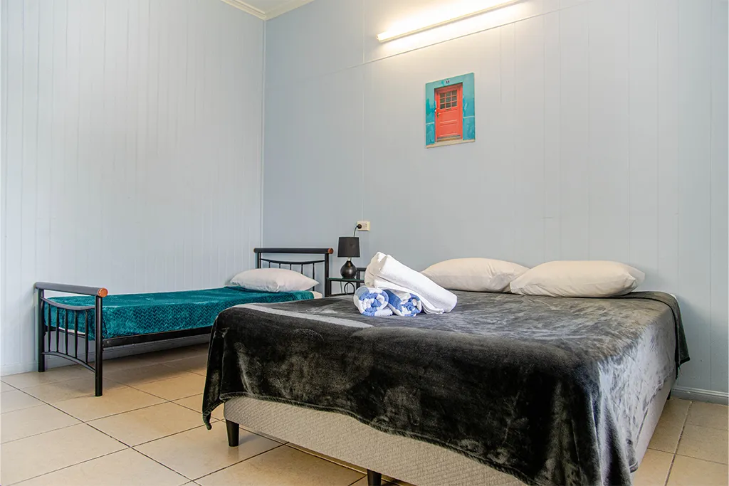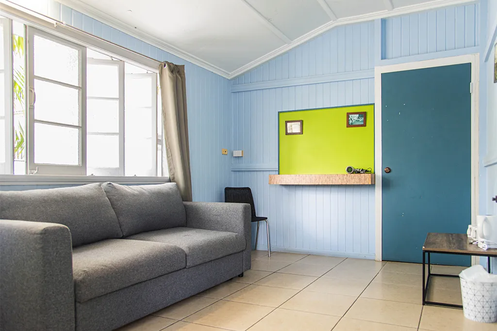 This double room features a separate and spacious living room, a bathroom with toilet and shower and an air conditioned bedroom.